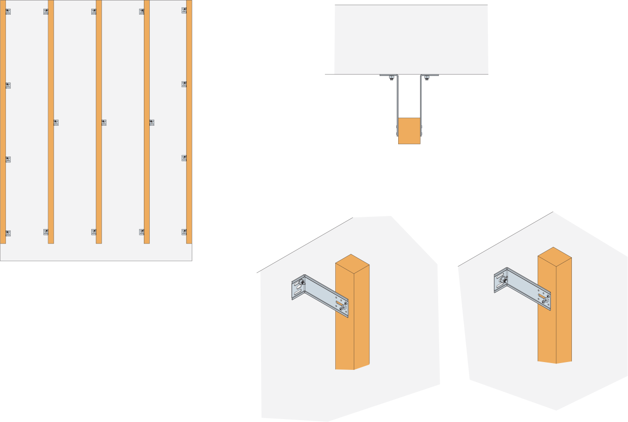 - Draw the position of brackets, in a staggered manner on either side of the position of the batten/profile. Min 3 bracket per batten/profile. For batten/profile under 80cm: min 2 brackets. The spacing of brackets depends on bracket and anchor capacity, with a maximum of 1m when using "L" profiles or under seismic specifications, and with a maximum of 1.35m otherwhise. When brackets cannot be set in a staggered manner, then the maximum spacing is 0.8m. The ovehang of batten/profile shall not exceed 0.25m.