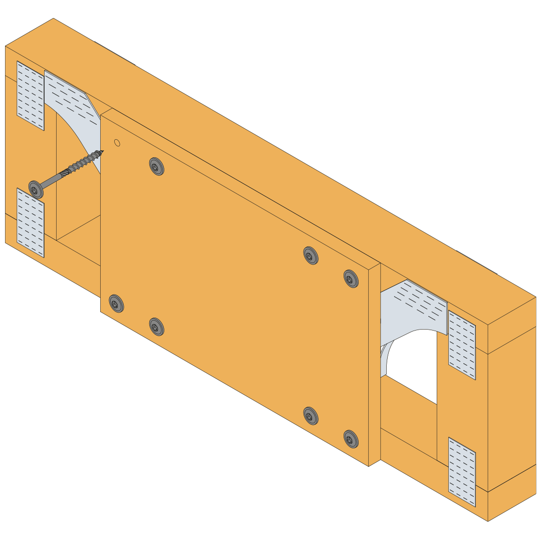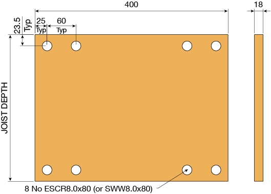 - Metal Web Headers Only: Install an 18mm plywood gusset to the face of the metal web joist. The plywood gusset is to be at least 400mm long and full depth of the metal web joist. The plywood gusset is installed with 8 No ESCR8.0x80mm screws. The screws are to be positioned in accordance to illustration below.