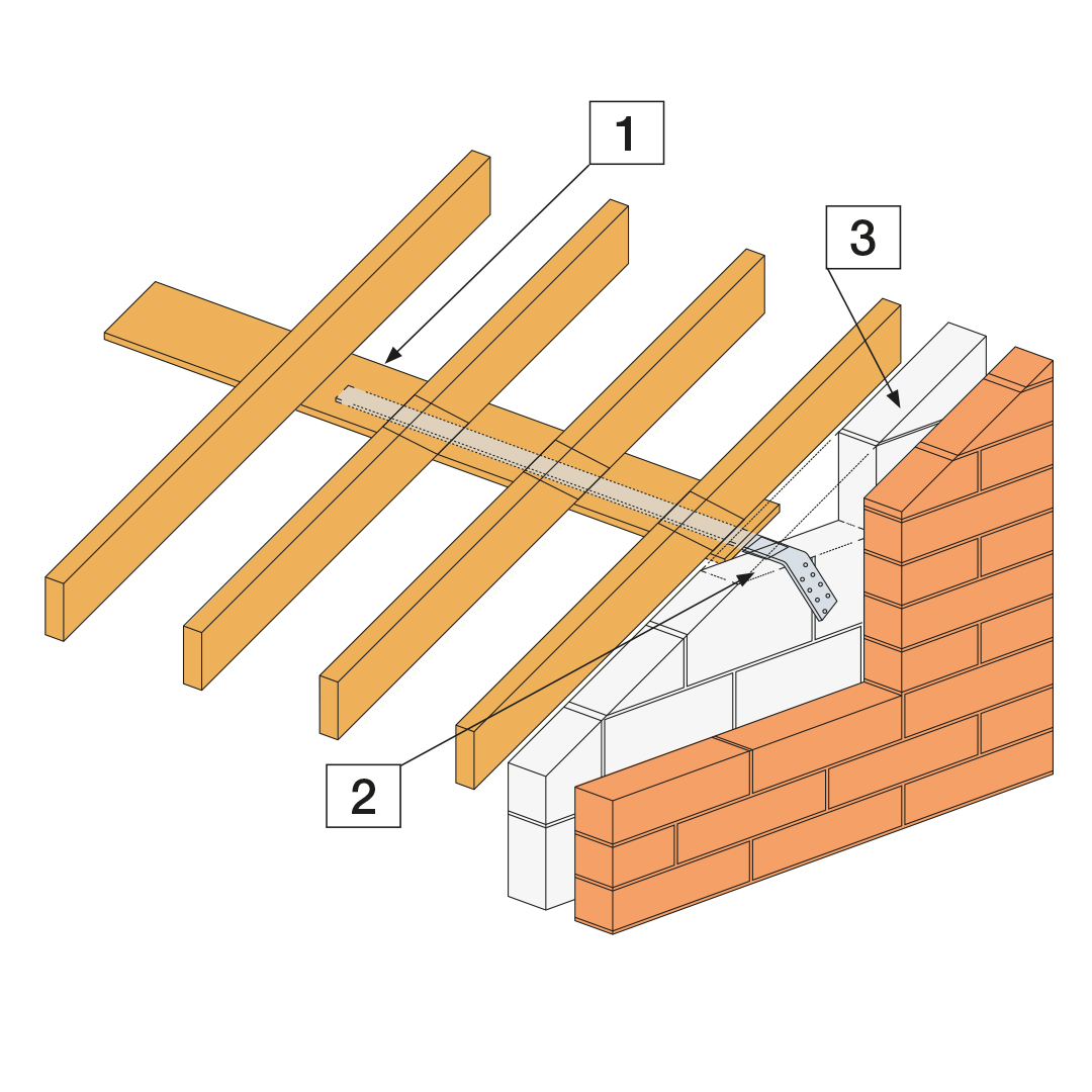 - Straps to be installed at not more than 2m centres (or 1.25m where appropriate) along pitch of gable end.