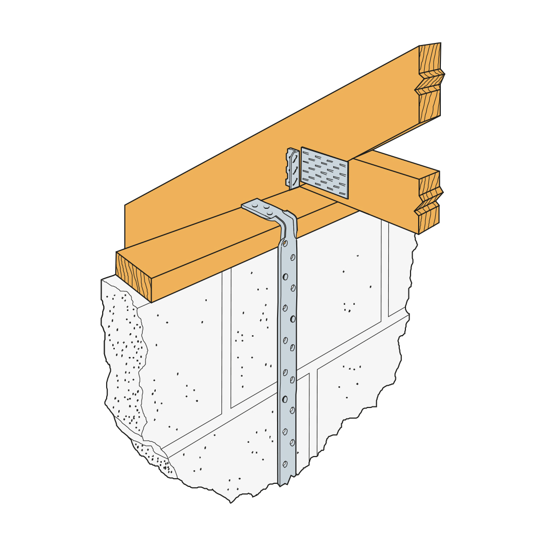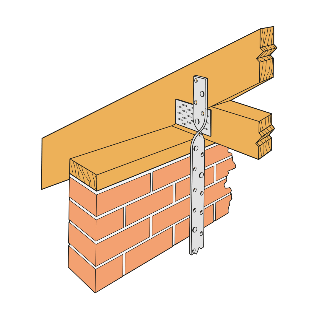 Fix LES or L strap to wall plate with 3 No 3.75 x 30mm square twist nails and to masonry with 5 No 5.5 x 50mm wood screws, plugged and screwed into masonry.