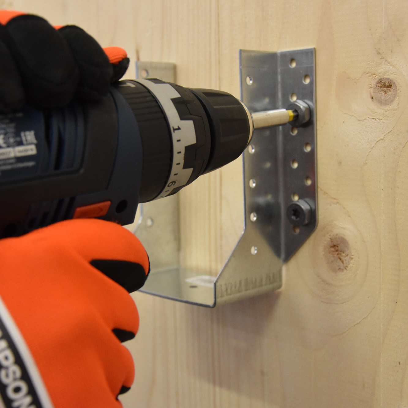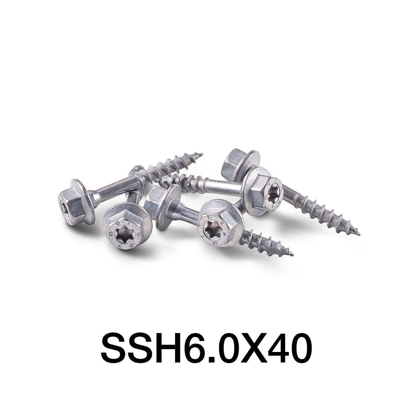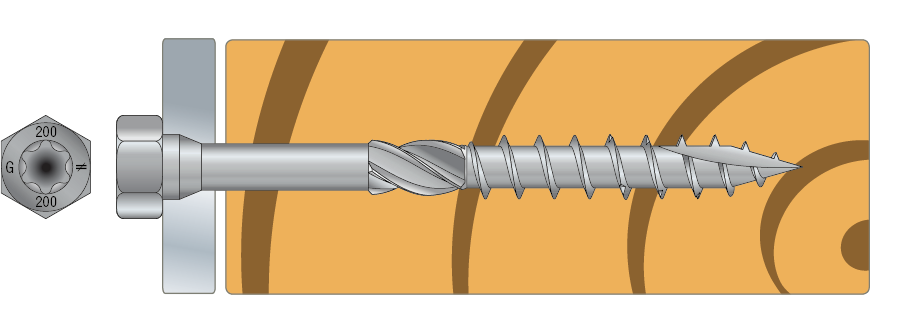 SSH is used together with connectors where high load capability is required. The conical shape under the head ensures full contact with the connector, creating a firm assembly. The superior Impreg®+ coating makes the screw suitable for exterior use. The type 17 cut point prevents timber from splitting, and the milling thread and serrated thread reduce the insertion torque. SSH has both 6 lobe drive and a hexagonal head, enabling installation both with torx bits or hex wrench.