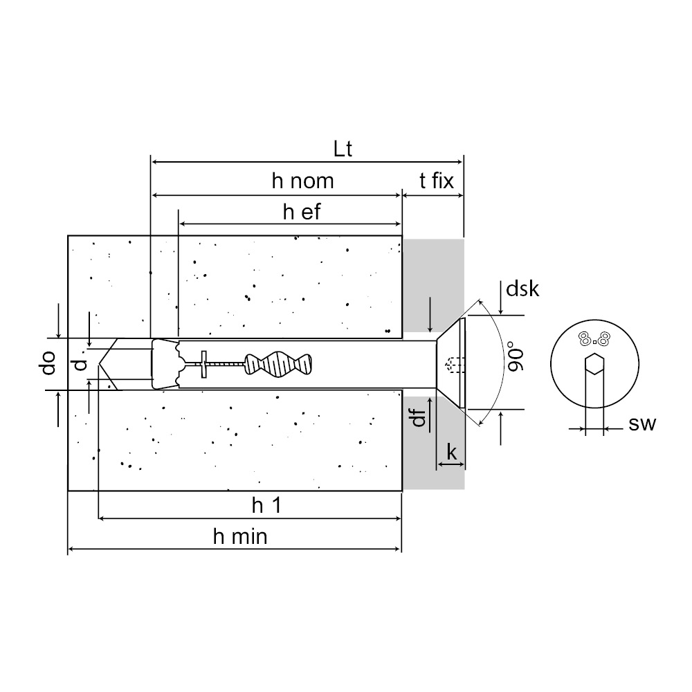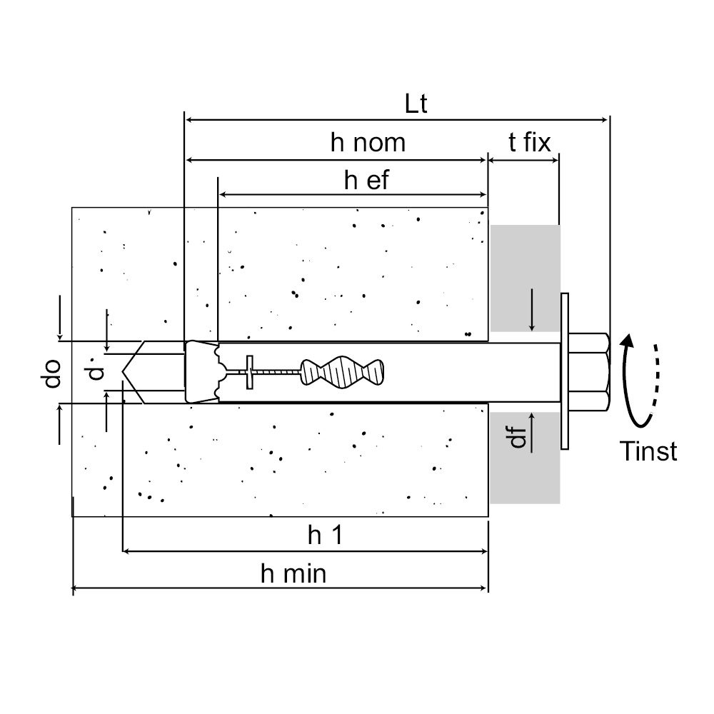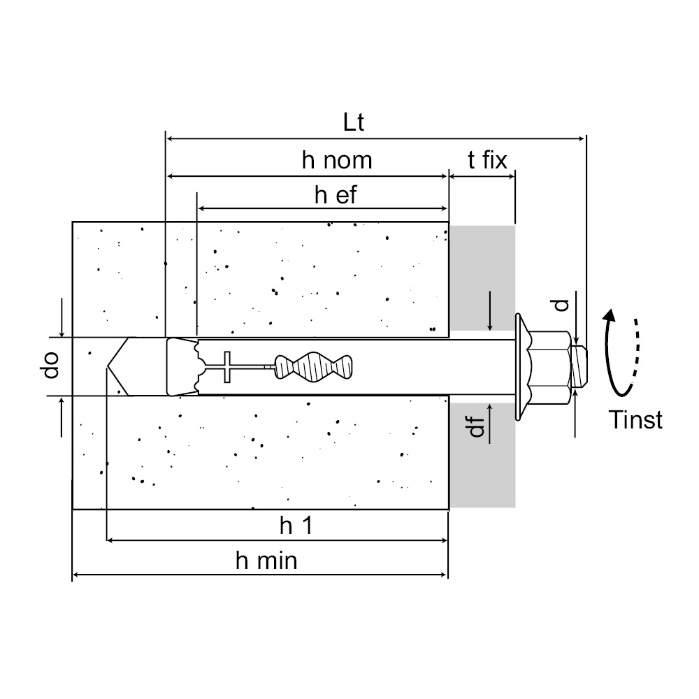 | References | Product Reference | Hole diameter / fixture thickness [do/tfix] [mm] | Plug [Ø x L] | Fixing thickness [max] | Screw diameter [d] [mm] | Min. hole depth [h1] [mm] | Nominal embedment depth [hnom] [mm] | Min. setting depth [hef] [mm] | Hole diameter in fixture [df] [mm] | Min. support thickness [hmin] [mm] | Torque [Tinst] [Nm] | Wrench [SW] | Total lenght [Lt] [mm] | Qty per box | Qty per outer box |