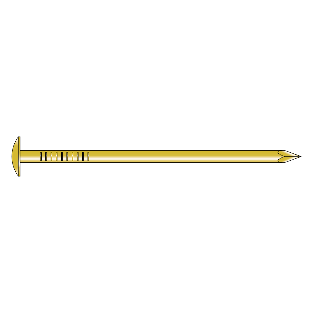 Brass pin with an oval head and round shank that can withstand rain, but used mostly indoors for fixing, e.g., mouldings and architraves to timber base material, as well as for various types of hobby activity.