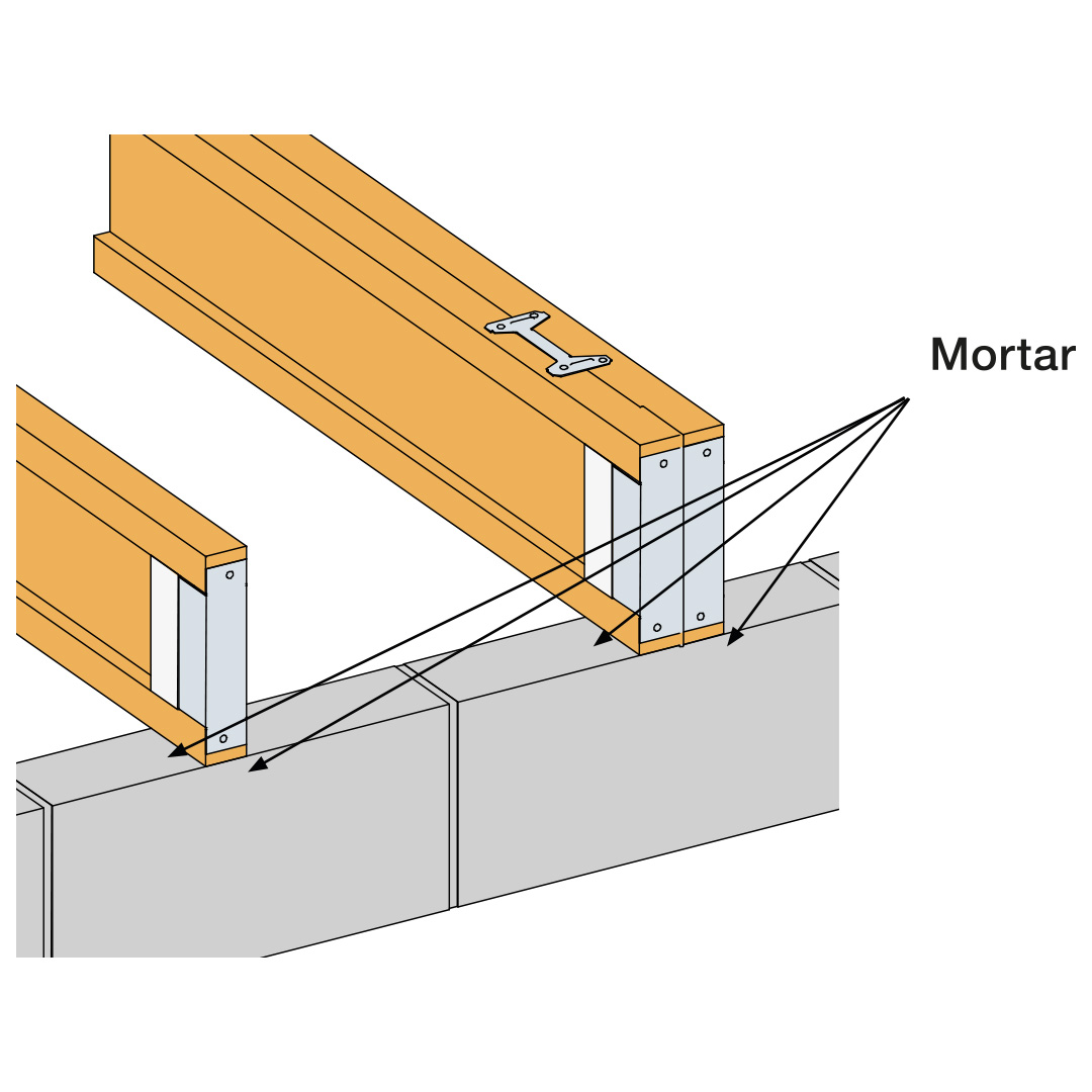 Step 4: Apply mortar to the void between the top and bottom chords of the I-Joist on both sides of a single joist and to the outsides of a double joist, ensuring the mortar is packed against the End Seal.