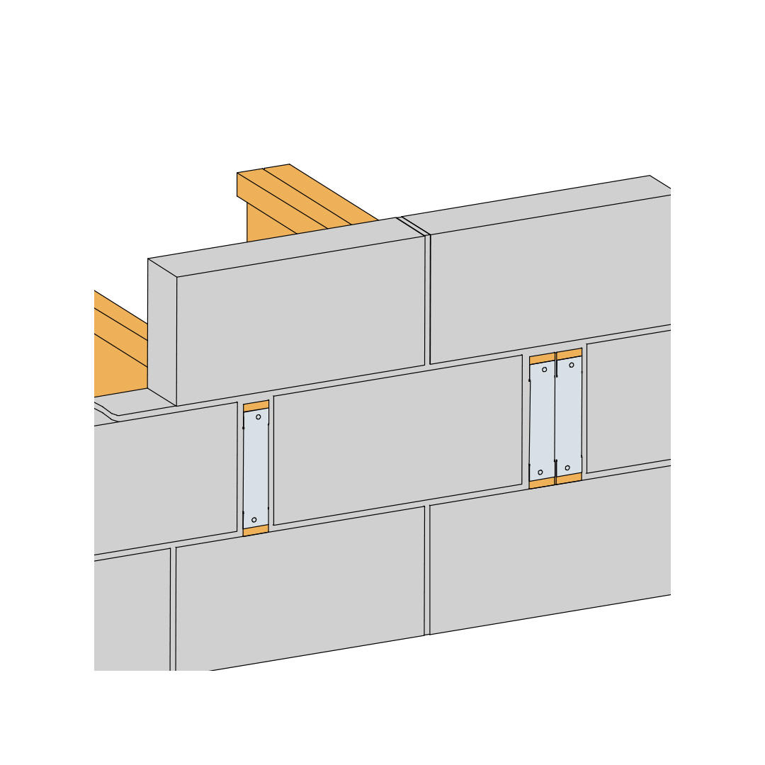 Step 1: Prepare block work to accept floor joists - no need for mortar on top. Position floor joists onto wall (only one joist shown for clarity). Fit the End Seal to the end of the joist as shown. Ensure that the End Seal is tight against the joist end and secure with 2 No 3.75x30 square twist nails.