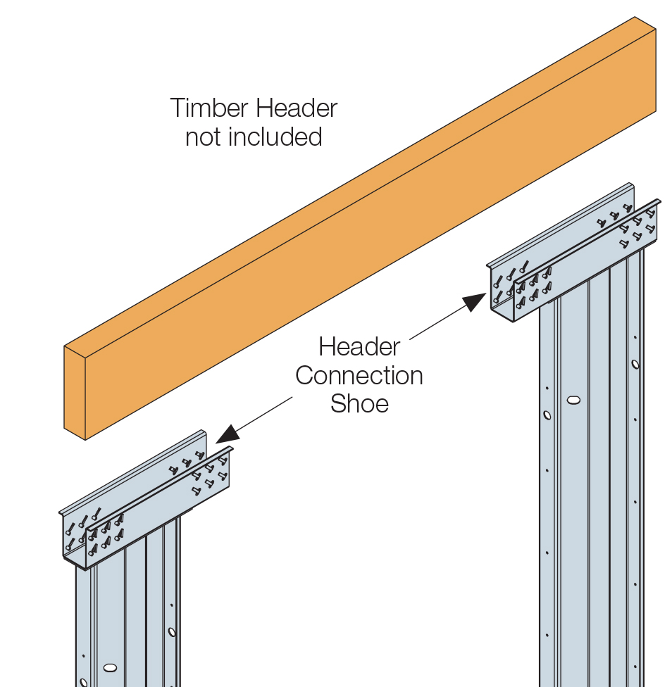 3a - Place the timber header (not supplied) between the left hand (LH) and right hand (RH) columns. It is recommended to use either Glulam or LVL structural timber for the header. See performance table for minimum size.