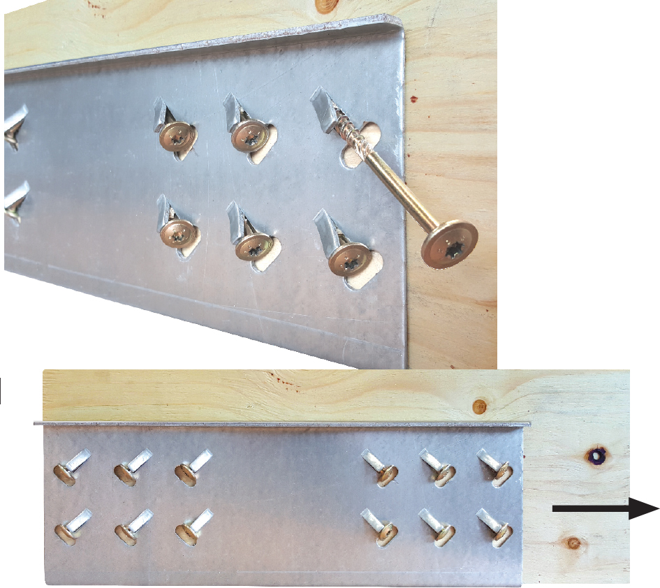 3b - Connect the timber header to the column using the ESCR screws provided via the angled holes in the header connection shoe (Fig 3b1). Ensure that the angle between the header and column is 90° (Fig. 3b2) and that there is no gap between the bottom of the header and the section of the column (Fig. 3b3).